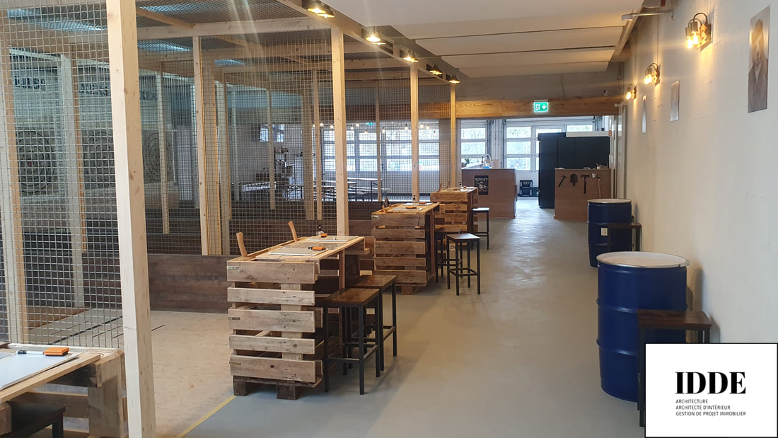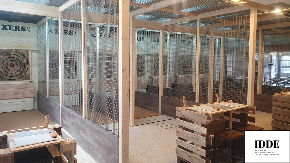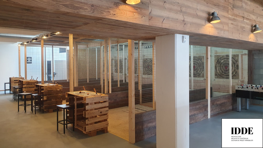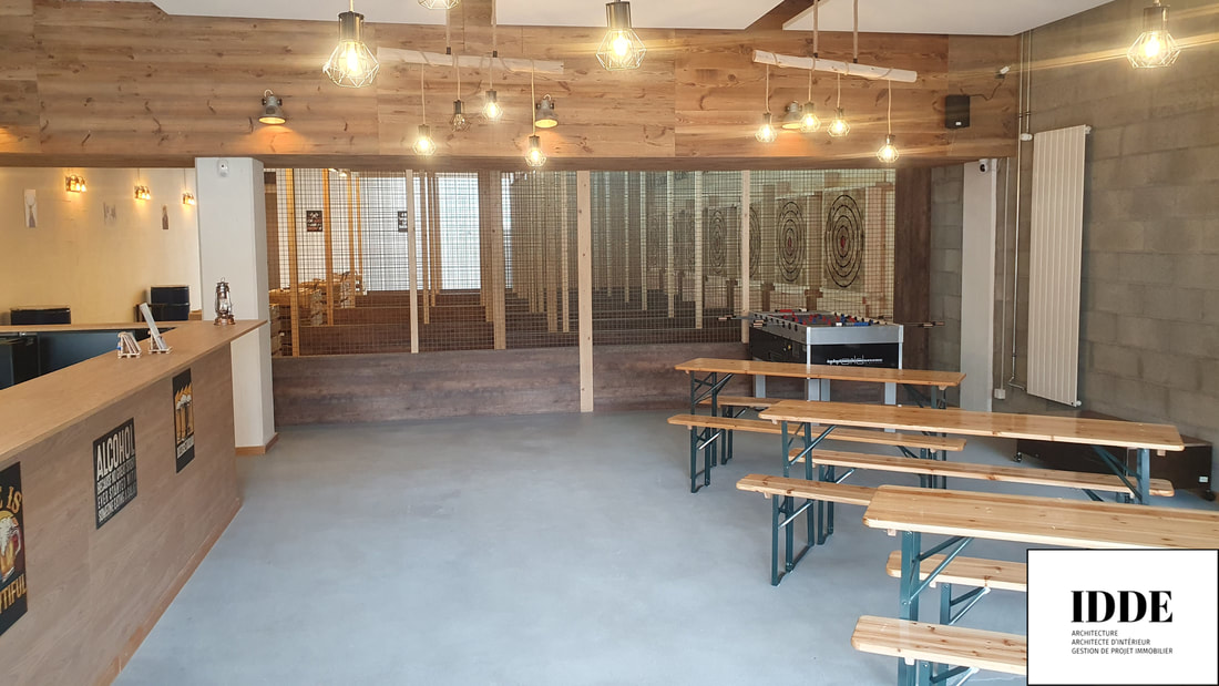Détails du Projet : Notre rôle a consisté à adapter un espace pour accueillir sept pistes de lancer de hache, ainsi qu’à concevoir un espace détente comprenant un bar et une zone d’accueil. Le design intérieur mélange harmonieusement des matériaux comme le bois, le béton et le métal, créant une atmosphère à la fois rustique et moderne adaptée à l’activité.